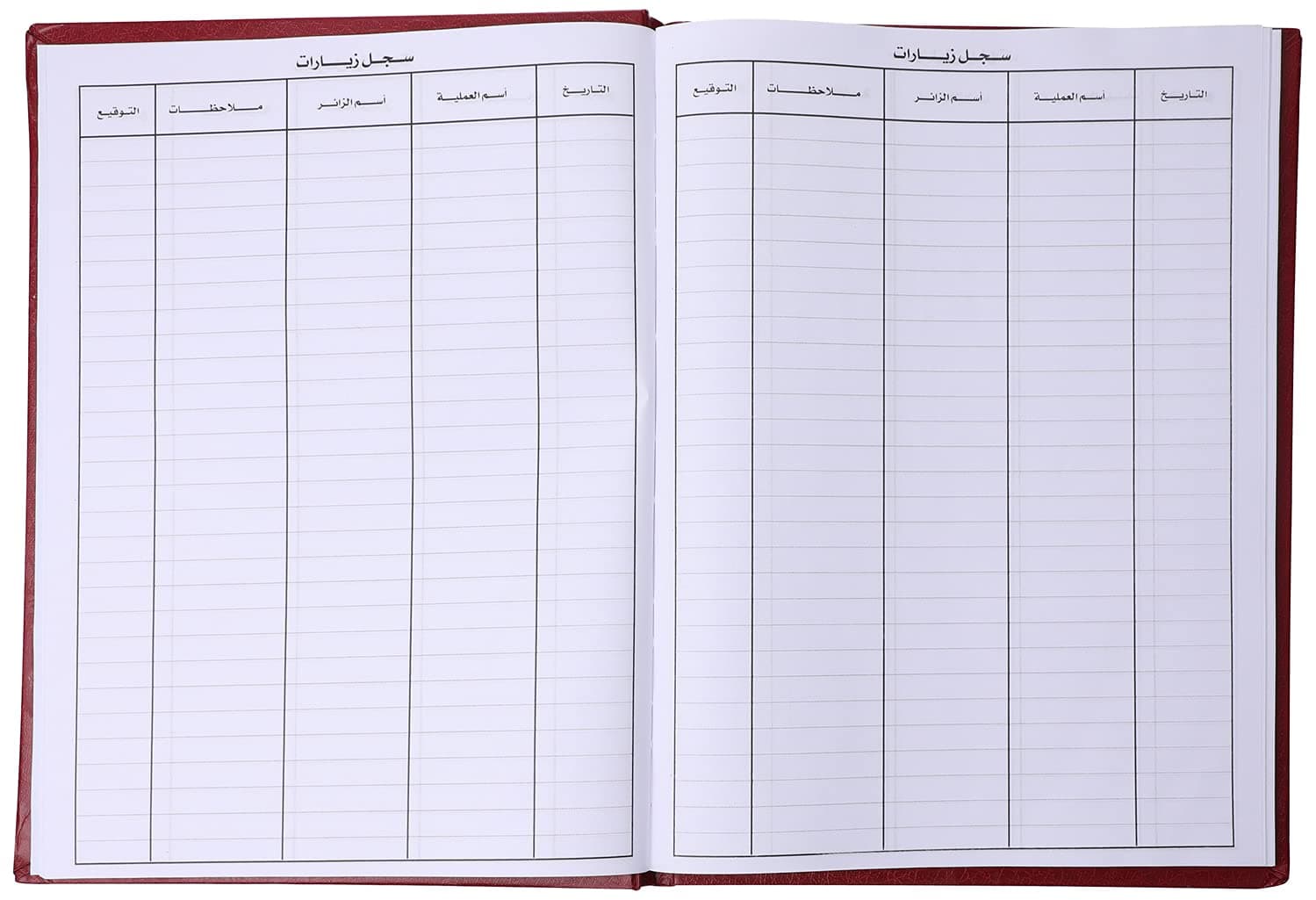 سجل أمان وتنظيم يحتوي على أعمدة لتدوين (اسم الزائر، وقت الدخول، الغرض من الزيارة، والجهة المقصودة)، مما يعزز أمن المؤسسة ويقدم إحصائيات دقيقة حول الحركة اليومية للضيوف. بياض الورق وجودته تضمن وضوح التواقيع والبيانات.